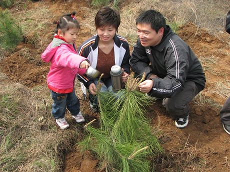 | 植樹前的合影 | 愛美的小姑娘,正準(zhǔn)備讓大山也變得像她一樣美麗。 |