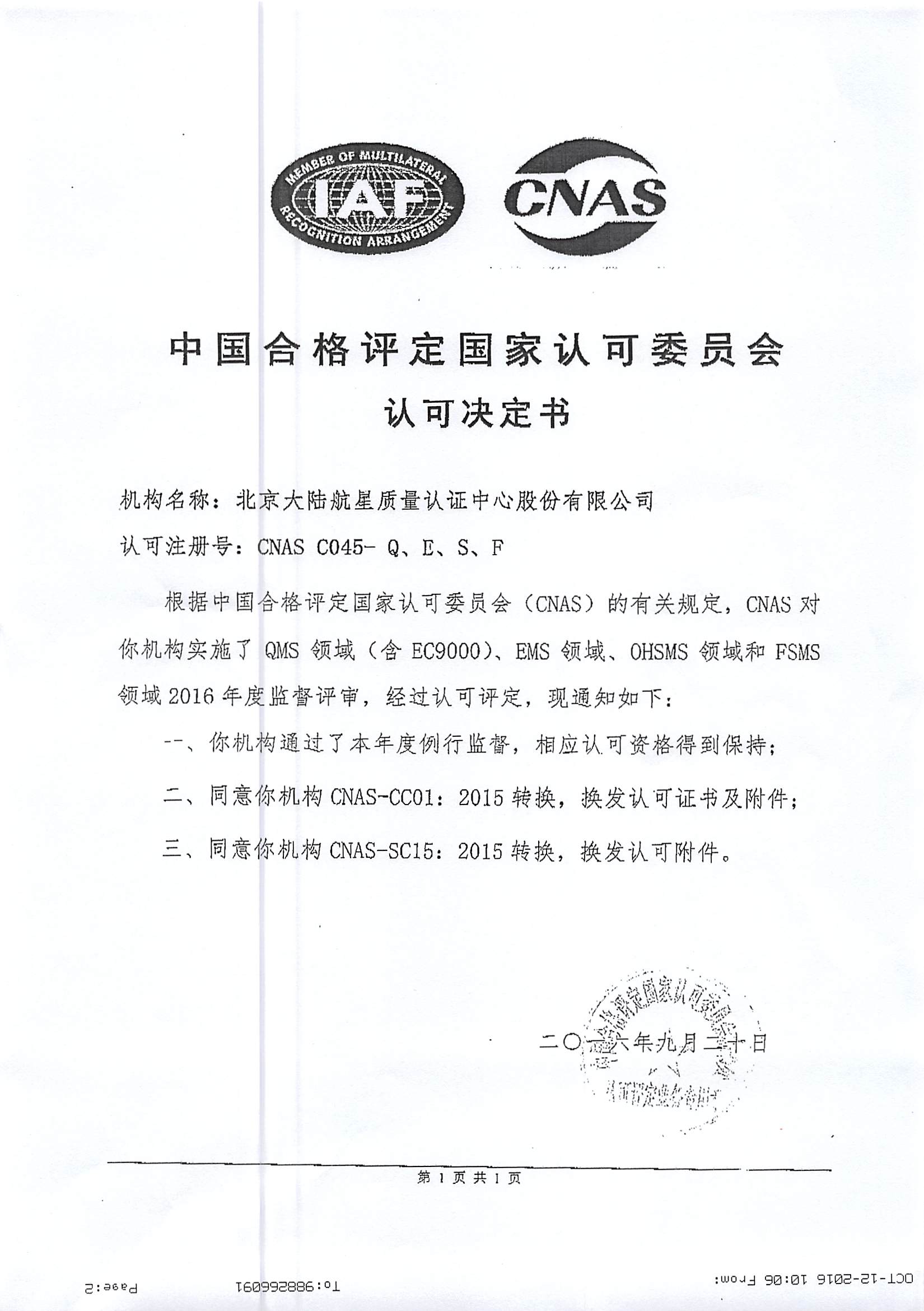 在管理層團(tuán)隊(duì)的引領(lǐng)下,經(jīng)總部各部門(mén)、各分支機(jī)構(gòu)及相關(guān)人員的共同努力,北京大陸航星質(zhì)量認(rèn)證中心股份有限公司(以下簡(jiǎn)稱HXQC),順利通過(guò)中國(guó)合格評(píng)定國(guó)家認(rèn)可委員會(huì)(CNAS),對(duì)我公司進(jìn)行的例行監(jiān)督、轉(zhuǎn)換及擴(kuò)大評(píng)審。保持了QMS(含EC9000)、EMS、OHSMS和FSMS認(rèn)證領(lǐng)域的認(rèn)可資格,并通過(guò)了CNAS-CC01:2015和CNAS-SC15:2015轉(zhuǎn)換評(píng)審,同時(shí)擴(kuò)大了我公司QMS(含EC9000)認(rèn)證領(lǐng)域南通分公司、杭州分公司、青山分公司、武漢分公司和天津分公司5個(gè)關(guān)鍵場(chǎng)所。