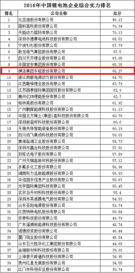 近日,新華網(wǎng)聯(lián)合唐宋大數(shù)據(jù)產(chǎn)業(yè)股份有限公司在北京發(fā)布的《2016年中國鋰電池企業(yè)綜合實力排名》榜單,對國內(nèi)主要鋰電池企業(yè)的綜合實力進行排名。于去年底開始組織實施鋰離子動力電池項目的橫店集團東磁股份有限公司,以其強大的實力和發(fā)展速度,強勢進入中國鋰電池企業(yè)前十榜單,位列第九。
