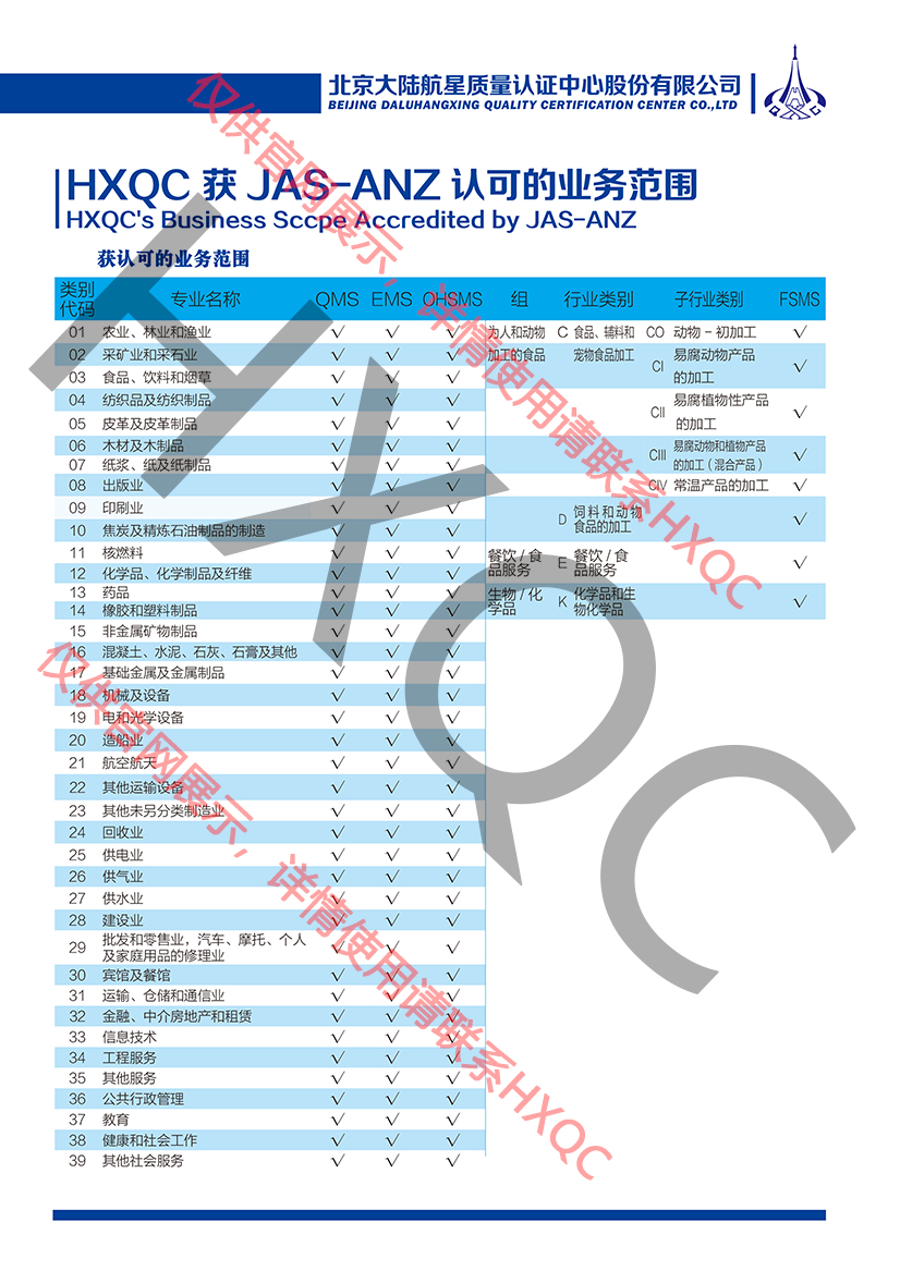 JAS-ANZ認(rèn)可業(yè)務(wù)明細(xì)